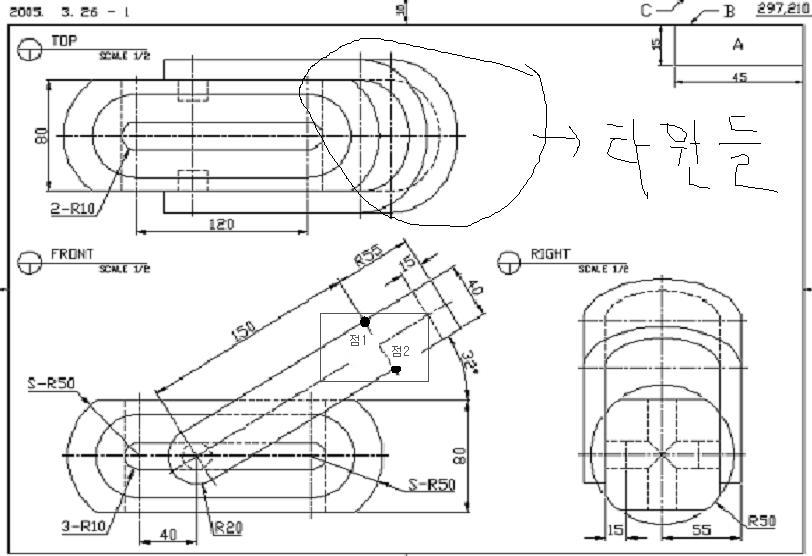 중심이 두개죠. 제가 점1, 점2 라고 적어 뒀죠?! 그게 중심입니다. 제가 여건이 좋지 않아서 지금..ㅋㅋㅋ 그냥 그림판으로 점 찍었어요. 여긴 캐드도 없고...뭐.ㅡㅡ; 참고하세요. 참!! 그리고 이 도면으로 ATC 자격증 준비하시는거 아니시죠?! 그냥 연습용으로 하세요. ATC 자격증은 유형이 바뀌었습니다. 요즘은 이렇게 쉽게 안나와요.ㅋㅋ *^^* 열심히 하세요.