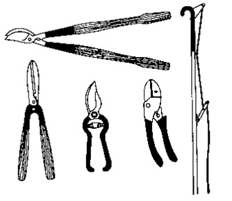 ㅇ가는 가지는 목가위를 쓰다. 다소 굵은 가지는 톱을 이용하여 자른다. 수관을 다듬을 때에는 긴 날의 가위를 쓰되, 자루의 중앙을 잡고 하면 힘이 덜 든다.