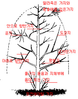 ㅇ 주가 되는 굵은 가지와 서로 교차되는 가지는 잘라 버린다.