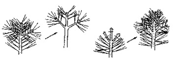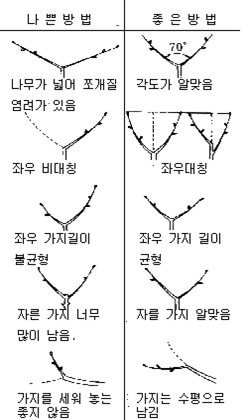 ㅇ 가지가 대생(對生) 또는 호생(互生) 일 때 좌우 균형이 되도록 하고 좌우 가지의 길이도 균형 있게 하기 위하여 같게 해주는 것이 좋다.