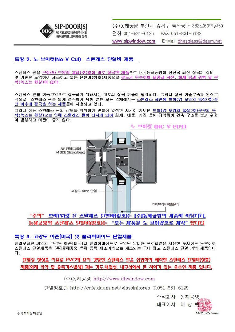 2.(주)동해공영 품은 국내 스테인레스 창호 제품(단열세이프도어,단열자동문,고정창)중 열관류율 최저 제품을 공급하는 제조업체입니다.