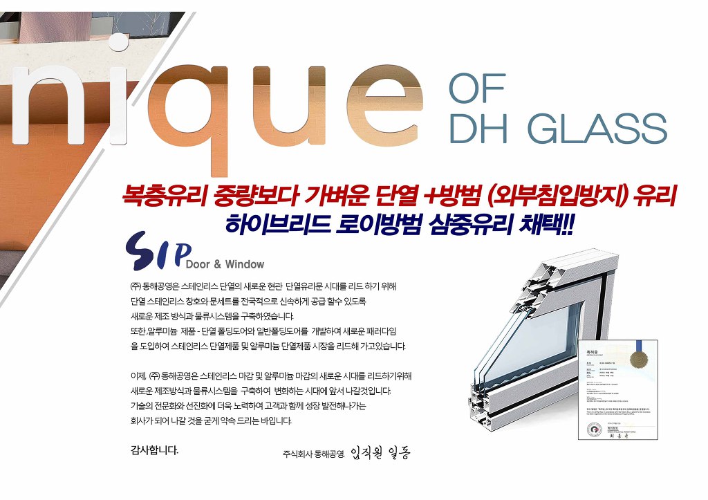 또한 신개념 가열 압착방식 복층유리 제조기술의 활용은 [주]동해공영의 SIP 단열 유리도어, SIP 단열창호 완제품 공급이 전국적으로 쉽고, 빠르고, 신속하게 공급 할 수 있는 시스템 구축이 가능하게 되어 시장 확산이 크게 기대되고 있다.