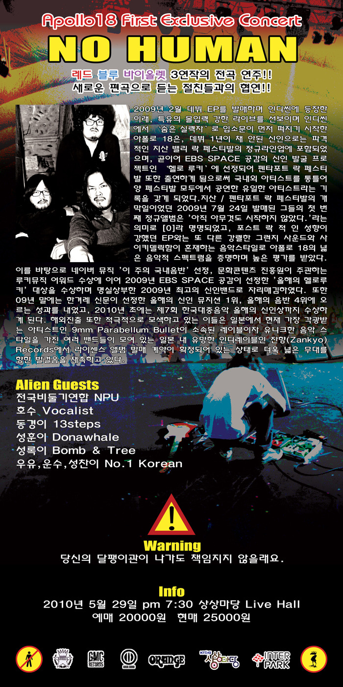 또한 그들과 오랜 시간 친분을 쌓아왔던 동료 뮤지션들이 게스트로 참가한다. 단순히 축하 공연 형식의 참여가 아닌 아폴로 18의 곡을 새로이 해석하고 참여하는 협연의 형태로 진행될 게스트들의 참가로 인해 앨범과는 전혀 다른 형태의 편곡들이 이어질 예정이며, 이는 관객들로 하여금 아폴로 18의 또 다른 매력을 만나볼 수 있는 시간을 제공할 것이다. 마지막으로 한국에서는 드물게 여러 종류의 한정판 밴드 상품들이 제작되어, 당일 공연장에서 독점 판매될 예정에 있다. 여지껏 한국의 락 밴드들이 보여주지 못했던 차원을 넘어서고자 하는 열망이 투여되어 정해진 공연의 제목 'No Human'처럼 이들은 현재 그들이 가지고 있는 모든 것을 이 공연을 통해 드러낼 것이며, 이를 통해 정말 경쟁력 있고 수준 높은 대중음악의 세계로 관객들을 이끌기를 원하고 있다.