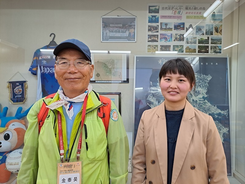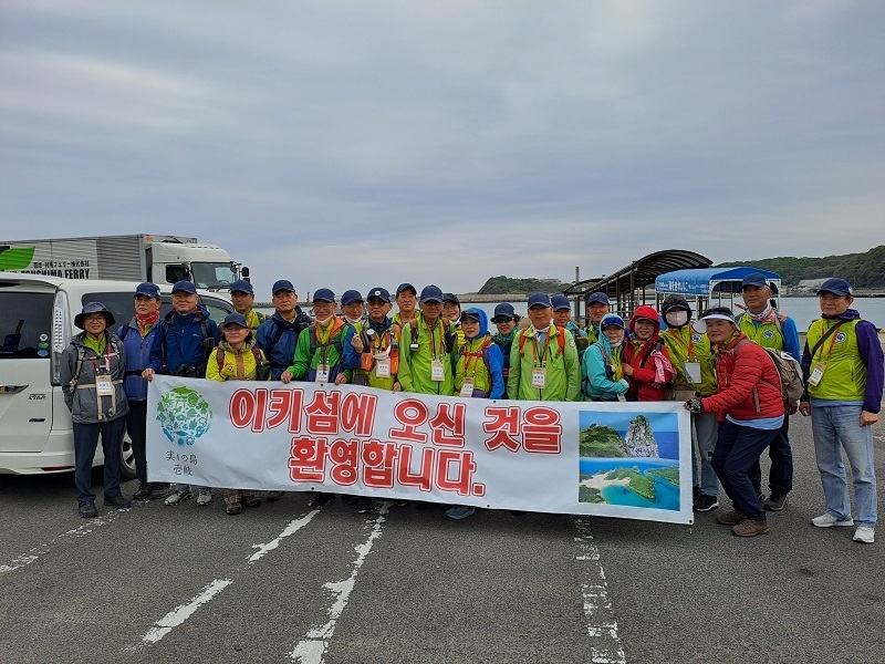 대합실 앞에서 간단한 영접행사를 가졌다. 이키관광연맹 간부의 인사, '이키를 찾은 21세기 조선통신사 한일우정걷기 여러분의 방문을 환영한다. 코로나로 침체되었던 이키의 활기가 되살아나는 발걸음이 되기 바란며 즐거운 여정이기를 빈다.’ 엔도 대표의 답사, ‘4년 만에 방문하는 감회가 깊다. 바닷길도 순탄하여 다행, 시청까지 14km 걷기에 좋은 날씨니 일정 잘 끝내고 저녁에 유명한 이키 소주로 즐기자.’