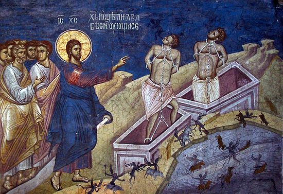 무덤에서 나온 더러운 영이 들린 사람을 예수님께서 만났습니다. 그 더러운 영을 아무도 휘어잡을 수가 없었지요. 그 안에는 군대라고 불릴 정도로 그 수가 많았지요. 이 마귀를 쫓아내시지요. 그런데 그 더러운 영들이 사람들이 산에서 놓아기르는 많은 돼지 떼에 들어간 것입니다. 마귀들이 들어갔던 돼지 떼가 호수를 향해 비탈을 내리 달려 호수에 빠져 죽고 말았습니다.