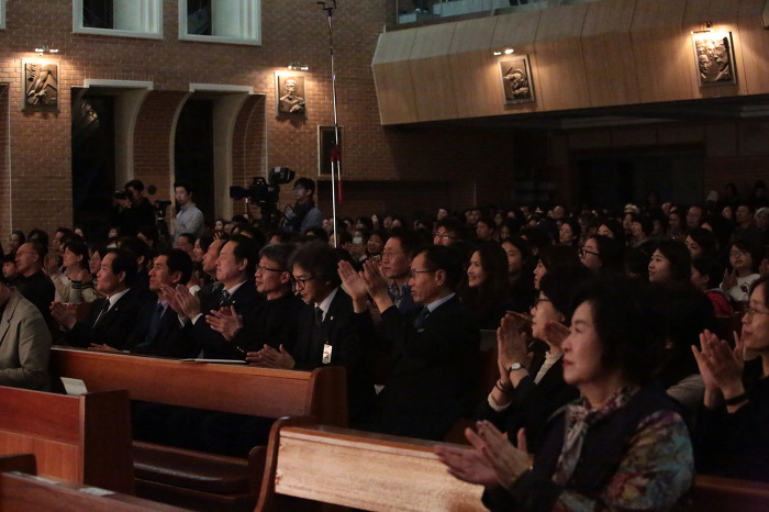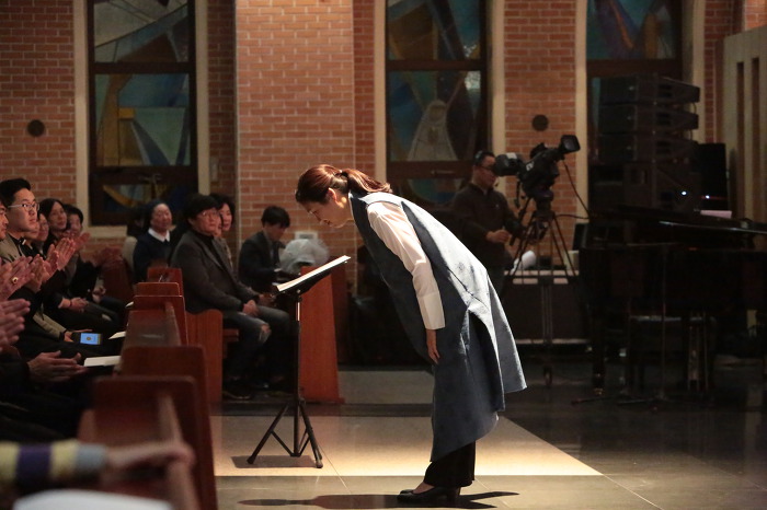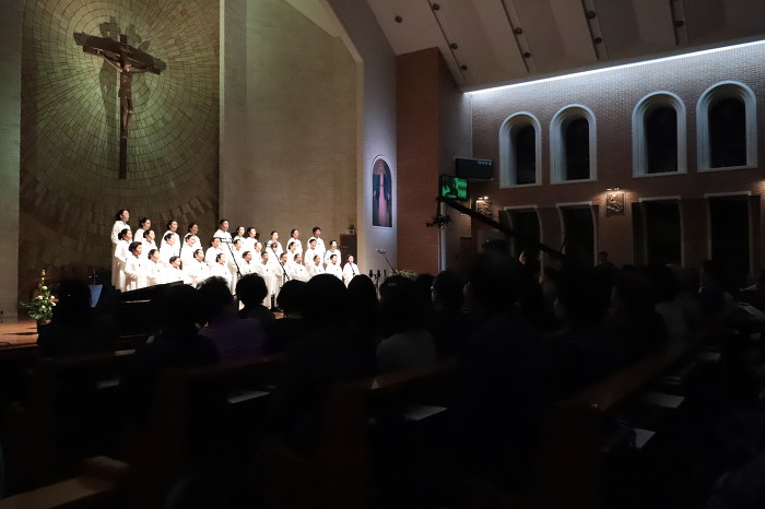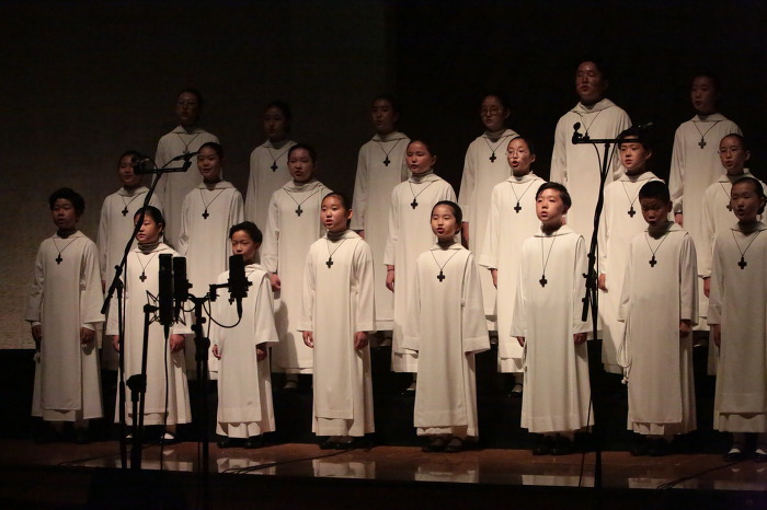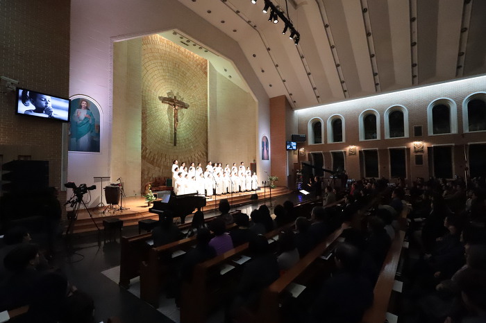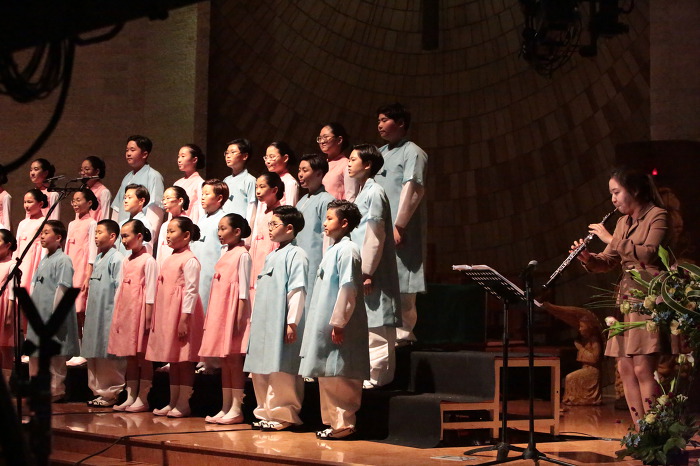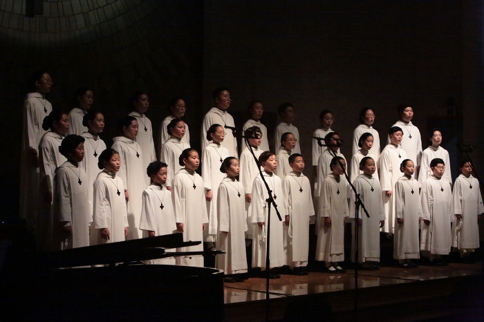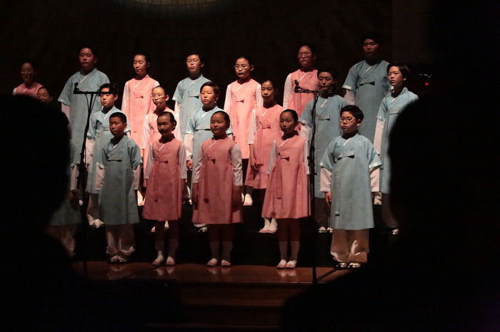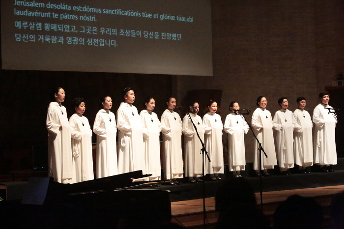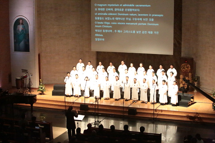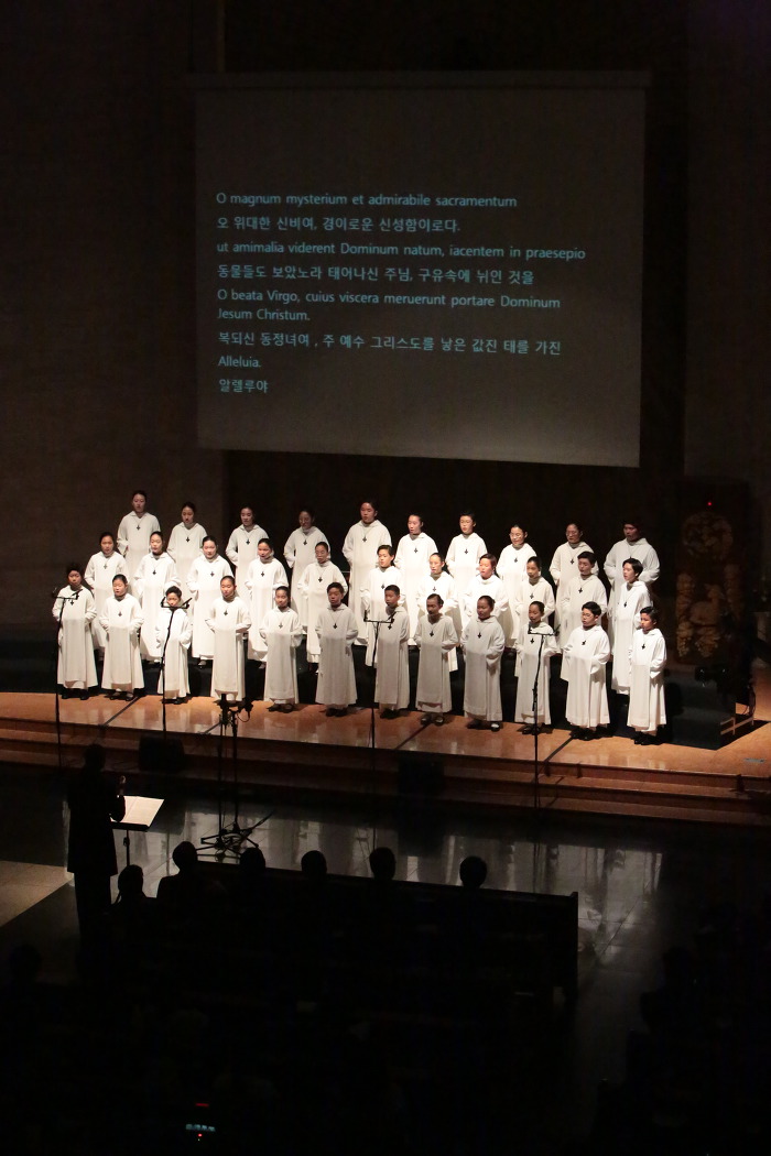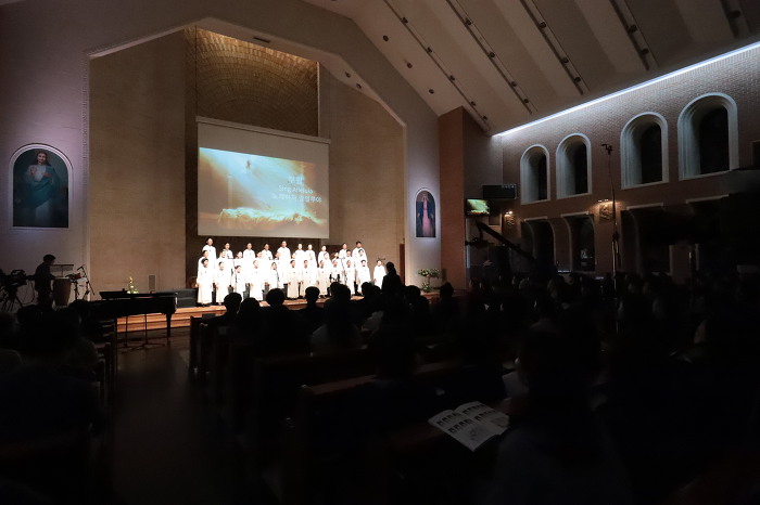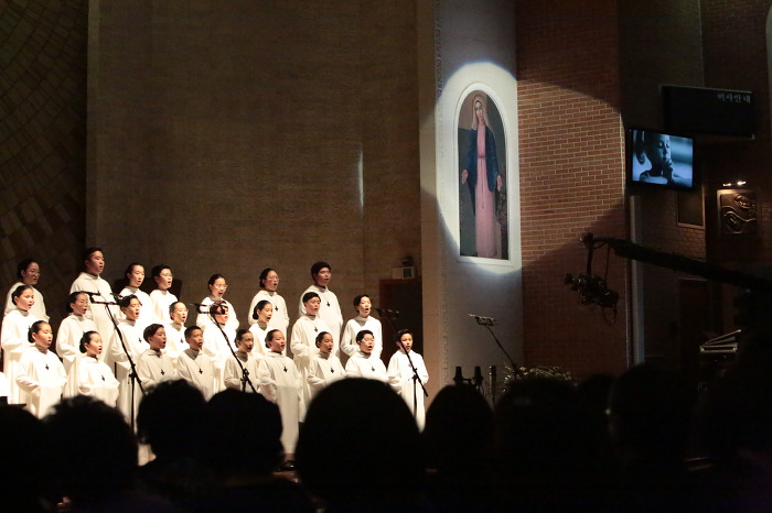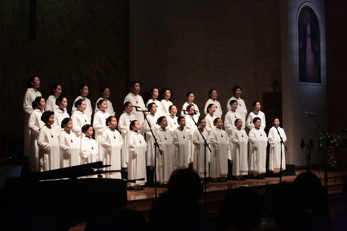 800여 청중의 환호 박수와 함께 앙코르를 받은 합창단은 ‘Libera Sanctus’(리베라 상뚜스) 연주로 관객에게 화답했다. 합창단은 이날 수도복 형태의 전례복과 한복인 단복을 갖춰 입고 공연했다. 전례 복장으로 연주할 때면, 단원들이 한마음으로 하느님을 찬미하고 기도드리는 수도자 같았다. 또 연한 장미색과 푸른색의 한복을 입고 노래할 때는, 하느님을 사랑하고 교회를 알리며 믿음을 굳건히 했던 순교 선열들을 떠올리게 했다.