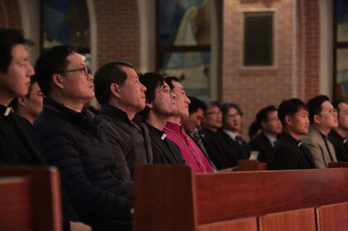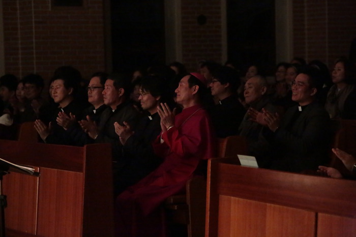 수원가톨릭소년소녀합창단 창단연주회에 참석한 교구장대리 문희종 주교(맨 오른쪽)와 사제들.