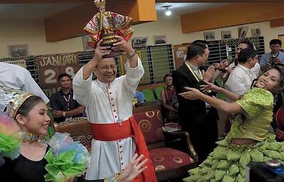 A girl hands Cardinal Charles Muang Bo an image of the Child Jesus upon the prelate's arrival in a Salesian shelter in Cebu. (Photo by Victor Kintanar) Related Reports |