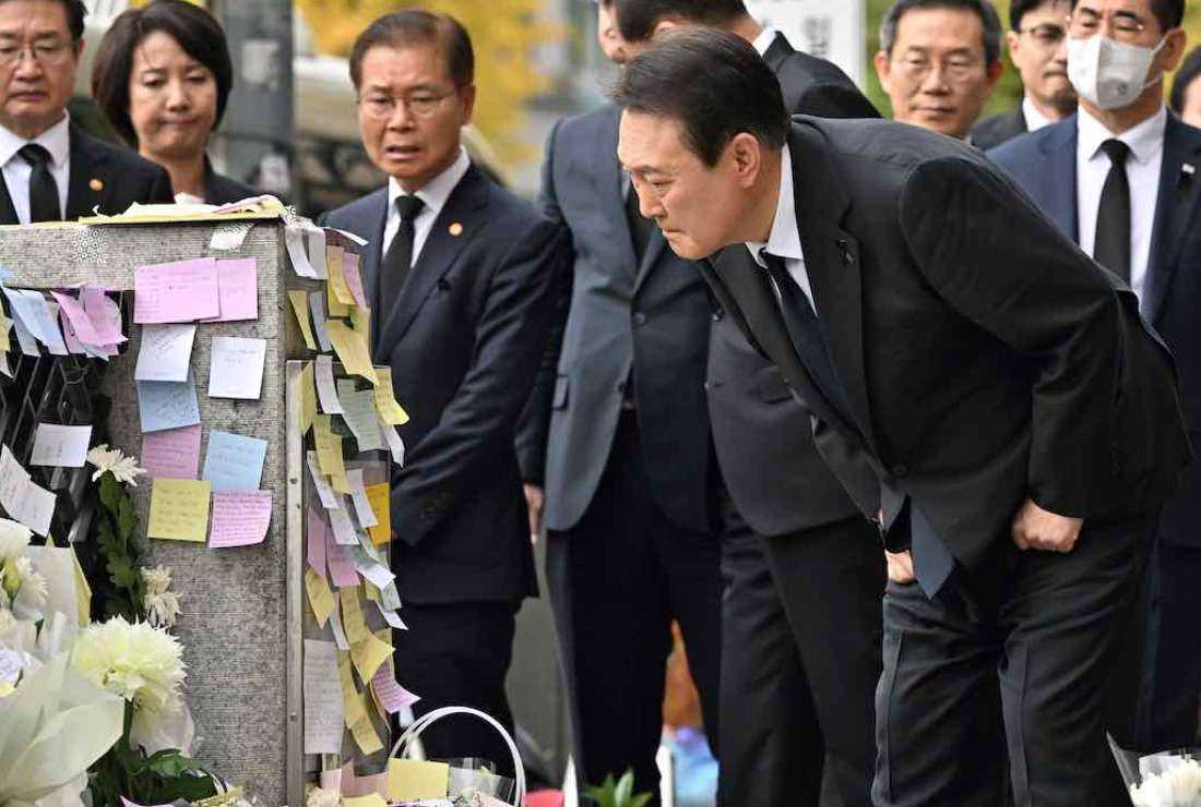South Korean President Yoon Suk-yeol looks at messages of mourners at a makeshift memorial for the victims of the deadly Halloween crowd surge, outside a subway station in the district of Itaewon in Seoul on November 1, 2022. (Photo by Jung Yeon-je / AFP)