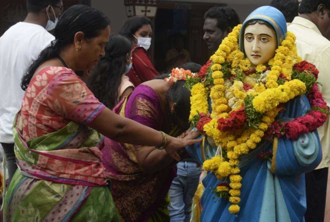 Catholic devotees offer prayers at a statue of the Virgin Mary during the annual feast of the Nativity of the Blessed Virgin Mary at the Shrine of Our Lady of Health in Hyderabad on Sept 8, 2022. (Photo: AFP)