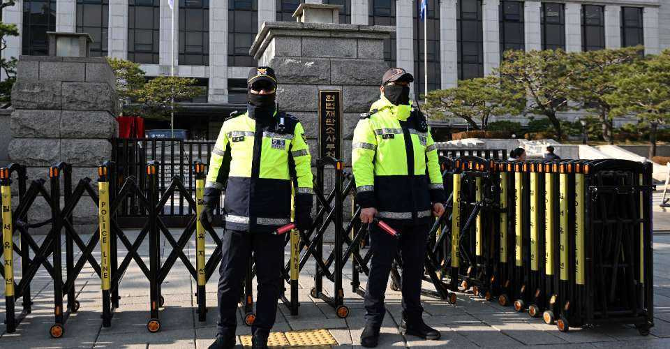 Policemen stand guard in front of the Constitutional Court in Seoul on Dec. 16. (Photo: AFP)