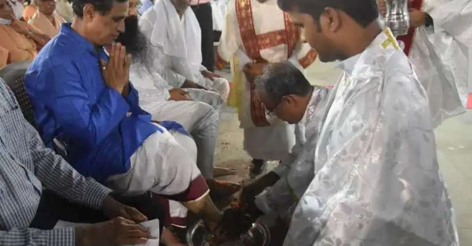 Father Reginaldo Antonio Mascarenhas, parish priest of St. Vincent Pallotti Church in Mumbai, India, washes the feet of people from Hindu, Sikh, Muslim and Christian communities on April 14, 2022, as part of Maundy Thursday rituals. (Photo supplied)