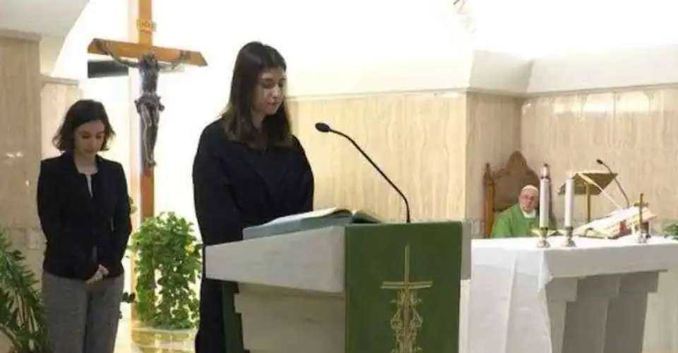 A laywoman reads at Mass in the Casa Santa Marta at the Vatican in February 2020. (Photo: Vatican News)