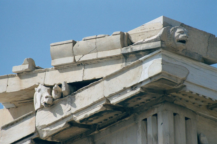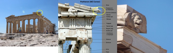 [사진 9] 아테네 파르테논 신전과 박공 네 귀퉁이에 설치한 빗물배출구. 빗물배출구 끝에 사자얼굴을 조각하였는데, 사자의 입을 통해 빗물이 떨어지도록 설계하였다. 바로 그리스식 가고일이다.