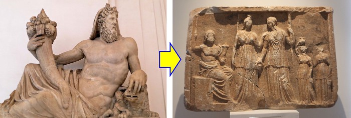 [사진 16] (왼쪽) 풍요의 뿔은 원래 강의 신 아켈로우스의 소유물이지만, (오른쪽) 지하세계의 염라대왕 하데스도 종종 풍요의 신으로 묘사된다. 그의 손에 풍요의 뿔이 들려있다. 오른쪽 두 여인은 하데스의 부인인 페르세포네(씨앗과 명계의 여신)와 장모인 데메테르(대지와 곡식의 여신)이다.작게 묘사한 두 여인은 숭배자이다. (그리스 아테네 국립 고고학박물관 소장품)
