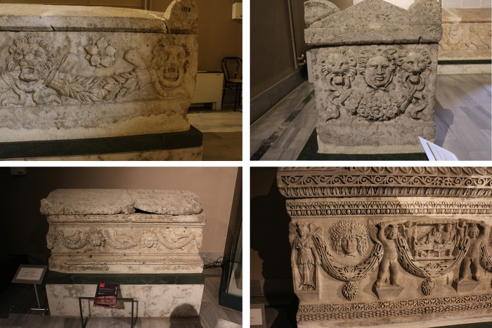 [사진 17] 고대 로마시대 석관의 벽면을 장식한 풍요의 뿔과 황소, 수사자, 메두사 얼굴상 (AD 2-3c): 여기서 사자와 메두사는 액막이 또는 벽사의 의미로 장식한 것으로 망자를 보호하는 일종의 수호신이다.
