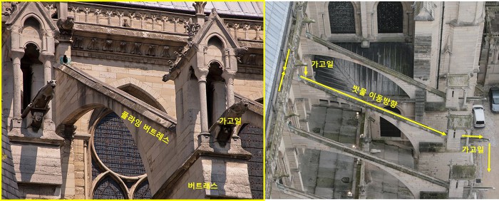 먼저 중세 고딕성당의 가고일이 무엇인지 알기 위해 고딕 건축양식에 대해 가볍게 집고 넘어가자. 12세기 중세 절정기에 프랑스에서 탄생한 고딕건축의 특징은 건물 외벽의 지지대인 플라잉 버트레스(Flying buttress)와 버트레스(Buttress), 뾰족한 아치(Pointed arch)와 갈빗대 모양의 둥근 천정(Rib vault), 그리고 장미창(Rose window)과 스테인드글라스(Stained glass)이다. 장미창은 바퀴창으로도 불리는데, 이에 대해서는 나중에 따로 다루기로 한다. [사진 7]에서 볼 수 있듯이 가고일은 플라잉 버트레스와 버트레스가 만나는 지점 또는 테라스 하부에 설치한 빗물 배출구인데, 기다란 석재방향을 따라 한가운데에 물길을 내고 석재의 정면에 기괴한 모습의 동물상이나 인물상을 조각한 다음 그 입을 통해 빗물을 뱉어내도록 한 건축부재를 일컫는다. 만약 가고일이 12세기 유럽의 고딕양식에서 처음 등장한 건축부재였다면, 중세 고딕건축의 특징 가운데 하나로 언급되겠지만, 이미 이보다 훨씬 오래 전인 고대 그리스.로마시대부터 존재했기에 중세 고딕건축 양식의 특징 가운데 하나로 언급될 수가 없는 것이다.