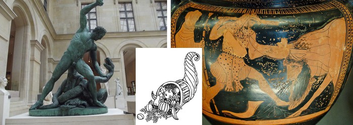 [사진 14] 아름다운 처녀 데이아네이라를 서로 차지하기 위해 헤라클레스와 싸우는 아켈로우스. 헤라클레스의 힘을 이겨내지 못하자 (왼쪽 사진처럼) 왕뱀으로 변신하여 달려들었으나 목이 졸리고 (오른쪽 사진처럼) 황소로 변신해 싸워보지만 헤라클레스에 그만 뿔이 붙잡혀 뽑히고 만다. 이 뿌리채 뽑힌 뿔이 풍요의 여신 코피아의 축복을 받아 (가운데 사진처럼) 맛난 과일과 향기로운 꽃으로 가득찬 풍요의 뿔이 되었는데, AD 2-3세기 로마시대 석관에서 흔히 볼 수 있다.
