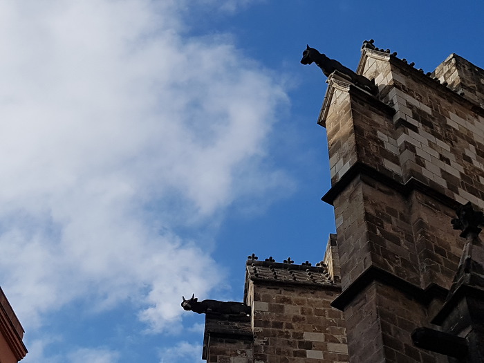 유럽의 왕궁이라면 웅장하면서 화려한 석조건물이 떠오르게 되는데, 고딕양식과 로마네스크 양식이 적당히 짬뽕된 아라곤 왕궁은 손바닥만 한 광장을 중심에 두고 높다란 건물이 디귿자로 에워싼 곳으로 왕궁의 위상에 걸맞지 않게 약간 갑갑한 느낌을 주었고, 건물 외벽엔 장식이 거의 없어 매우 소박하다는 느낌도 주었다. 디귿자로 에워 싼 건물의 외관을 쓱 훑어보던 중에 처마 아래 길게 나와 있는 빗물배출구인 가고일(Gargoyle)이 내 눈길을 잡아끌었다. 기괴한 괴수의 모습을 한 가고일은 유럽의 고딕성당에서나 볼 수 있는 줄 알았는데 왕궁 건물에도 설치되어 있어 조금 특이하다는 생각이 들었다. 그러나 가고일이란 게 건물 벽체가 빗물로 인해 검게 얼룩지거나 돌 벽돌을 쌓아 올릴 때 접착제로 사용된 모르타르가 빗물로 침식되는 것을 막기 위해서 지붕을 타고 흘러내린 빗물을 모아 벽체로부터 멀찌감치 떨어져 배출시키는 빗물배출장치이므로 중세의 끝자락인 15세기에 아라곤 왕궁의 처마 밑에 가고일을 설치한 것은 하등 이상할 것 까지는 없을 것이다.