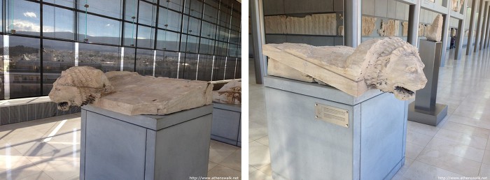 [사진 11] 아테네 아크로폴리스 박물관 4층에 판아테나이아 대축제 행렬을 묘사한 부조와 함께 설치된 사자상 가고일.
