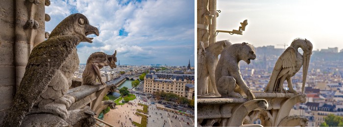 필자가 가고일을 처음 본 것은 2007년 봄에 방문한 프랑스 파리의 시테 섬 동쪽에 있는 노트르담 대성당에서였다. 프랑스어로 ‘성모 마리아’를 뜻하는 노트르담 성당은 중세 절정기였던 12세기에 고딕 양식의 건축물을 창안한 프랑스에서도 초기고딕 양식을 대표하는 건축물이다. 정면에서 바라 본 노트르담 사원은 왼쪽과 오른쪽에 직육면체형의 종탑이 대칭으로 높이 솟아있고, 건물의 한가운데에는 바퀴살이 촘촘히 박힌 바퀴 모양의 커다란 창이 설치되어 있고, 맨 아래에는 뾰족 아치형 출입문이 세 개 놓여있는 매우 웅장하면서도 비례가 아름다운 중세 고딕 건축물이었다.