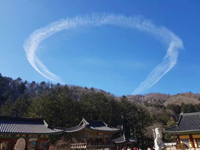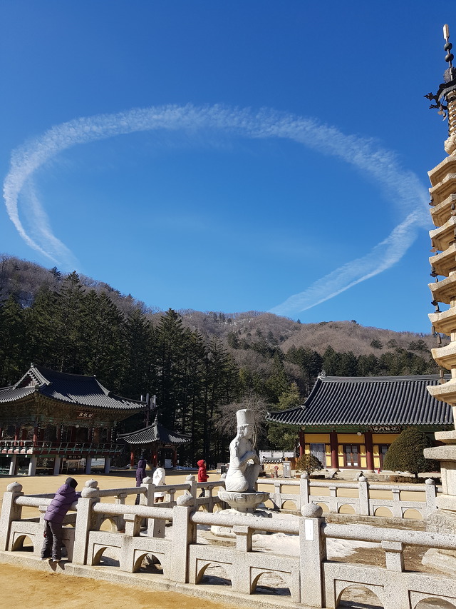 때마침 월정사 하늘 위에는 비행운처럼 보이는 동그란 구름이 바람결에 흘러왔습니다. 비행운일 것이라는 짐작을 했지만 신비한 느낌이 드는 것은 어쩔 수 없었습니다. 마치 필자가 이곳을 방문한 목적을 하늘이 알고서 이렇게 환상적인 구름을 띄워 반겨주는 것은 아닐까? 하는 나 혼자만의 상상의 나래를 펼쳐봤습니다.