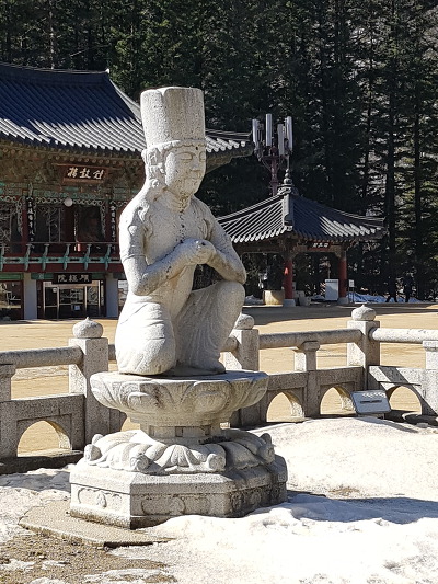 [사진7] 월정사의 가람배치는 범천상-석탑(비로자나불)-적광전(비로자나불을 모신 금당)이 일직선 상에 놓이는 구조이다. 이 석조인물좌상은 '석조보살좌상'이 아니라 '석조범천권청설법상' 또는 '석조범천권청전법륜상'으로 불러야 한다.