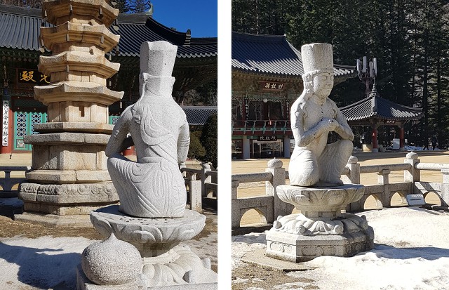 [사진 6] 월정사 8각9층 석탑 앞 석조인물좌상은 불법의 수호신, 범천이다. 마하박가의 '범천권청' 이야기와 너무나도 똑같은 차림새와 자세를 하고 있기 때문이다. 합장한 두손에는 뭔가를 꼽은 듯한 구멍이 뚫려 있는데, 마하박가의 범청권청 이야기에 비춰보면, 구리로 만든 연꽃의 줄기를 꼽았을 가능성이 높다. 범천권청(梵天勸請)이야말로 불교에서 가장 드라마틱한 장면이다.