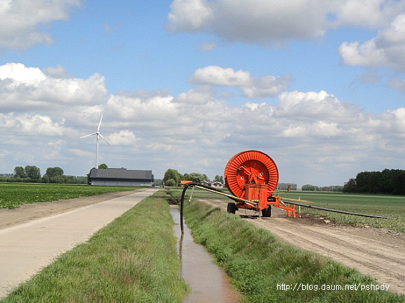 길 오른쪽에 있는 튤립밭(아래사진). 웅웅거리면서 스프링쿨러는 자기 혼자 사람도 없는데, 열심히 튤립밭에 물을 주고있고, 스프링쿨러의 물은 위 사진의 기계설비를 가지고 자동으로 펌프질을 하고 있었습니다.