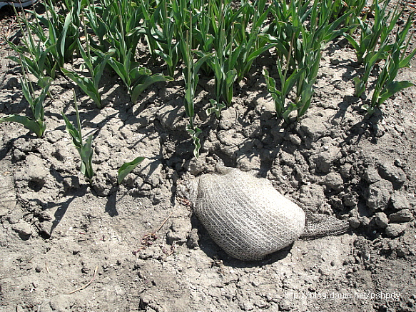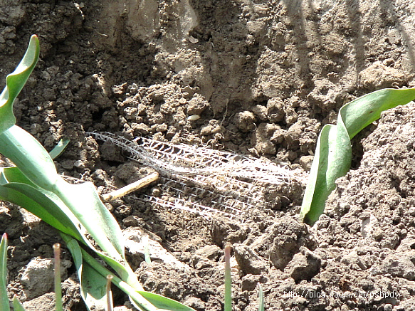 밭 입구에 있는 망의 끝자락. 이 부분을 당겨 올리면 전체 구근이 한번에 따라 올라오는 시스템이었습니다.