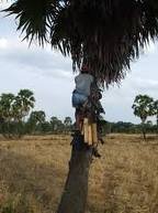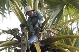 수액을 추출하기 위해, 종려나무 꼭대기에 올라가서 꽃눈을 칼로 베어내고 이 꽃눈 밑에 통을 갖다 대어 샘물 솟듯이