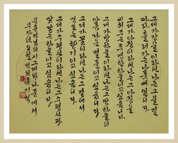 [[소개]]그대와 나 - 백천 류지혁님 作 작성자霓苑(예원)|작성시간11.12.21|조회수430 목록 댓글 4 글자크기 작게가 글자크기 크게가 * 서예세상 한글세상 * cafe.daum.net/callipia 다음검색 현재 게시글 추가 기능 열기 북마크 신고 센터로 신고 댓글 댓글 4 댓글쓰기 답글쓰기 댓글 리스트 작성자翠田 | 작성시간 11.12.22 좋은 글은 스크랩해 갑니다.감사합니다. 작성자三道軒정태수 | 작성시간 11.12.22 잘 보고 갑니다^^ 작성자芝香 | 작성시간 11.12.24 아름다운시를 멋진작품으로 완성하셨군요... 작성자혜지 | 작성시간 12.02.26 글씨가 너무마음에들었어요 열심히따라가 보겠읍니다감사합니다 댓글 전체보기