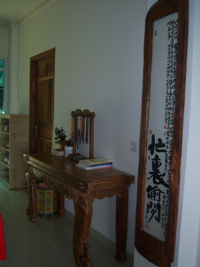 선생님께서도 익히 아시다시피 추사 선생님의 "산숭해심"이라는 글씨는 추사 선생님 서예의 최고봉으로 인정받고 있습니다. 실물은 현재 호암미술관에 있습니다.(물론 산숭해심만이 아니고 다른 네 글자와 같이 있습니다.) 그런데 참 이상하게도 그리고 저와 같이 서예에 문외한으로서는 이해하기 어려운 점이 있었습니다. 호암미술관 소장본의 글씨와 제 현판 글씨가 너무도 다르다는 사실입니다. 특히 "山"자와 "海"자에서 그런 느낌을 받았습니다. 제가 처음 제 현판을 구한 후 이 글씨와 호암미술관에 있는 것과를 서로 비교해 본 적이 있는데 솔직히 말해 -