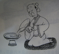 그릇의 손잡이로 다른 그릇에 물을 따르는 모양이다.