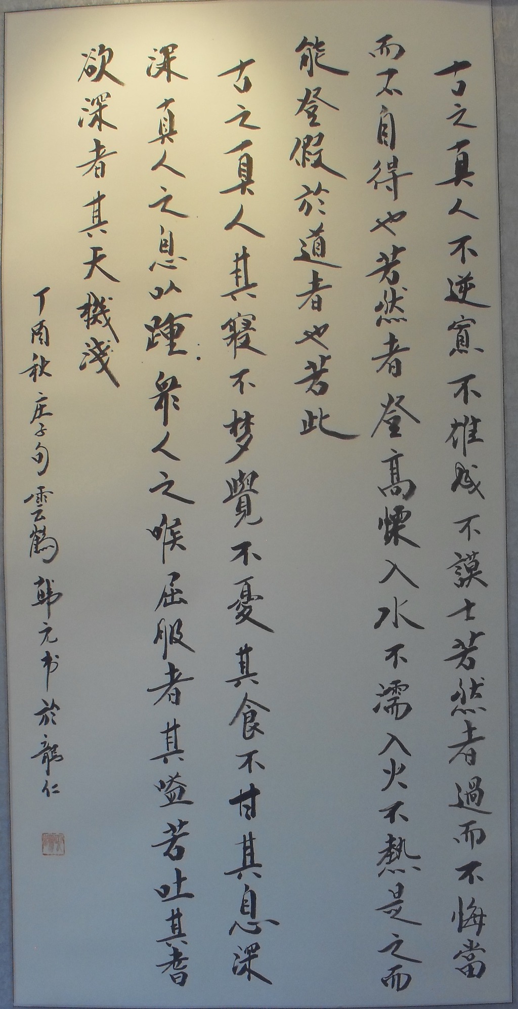 古之眞人 고지진인 不逆寡 불역과 不雄成 불웅성 不謨士 불모사 過而弗悔 과이불회 當而不自得也 당이불자득야 若然者 약연자 登高不慓 등고불표 入水不濡 입수불유 入火不熱 입화불열 是知之能登假於道者也若此 시지지능등가어도자야약차