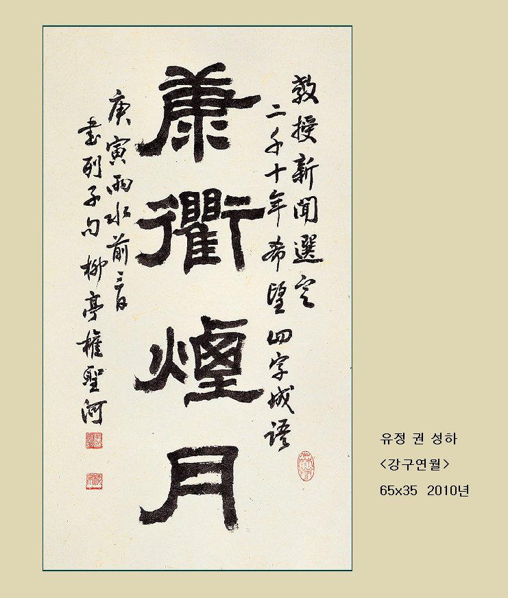 작성자松亭 작성시간 10.11.15 유정선생님:안녕 하세요? 귀한 작품을 구상 하셔서 출품을 하시느라 수고 많이 하셨습 康衢煙月강구연월:康강은 五達오달의 道도,衢구는 四達의 道도로 변화한 네거리.煙月연월: 흐린 달빛이라고 합니다.그러한 글을 선정하신 교수님들의혜ㅖ안에 찬사를 보냅니다 예서 작품에 설명은 행서로 멋진 휘호가 운필의 묘를 살리셔서 귀한 작품으로 승화하셨습니다. 귀한 작품 출품을 하여주서 안복을 누렸습니다. 늘 행복 하시구요. 건필 하세요. *^^*