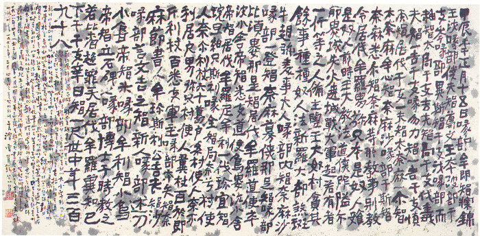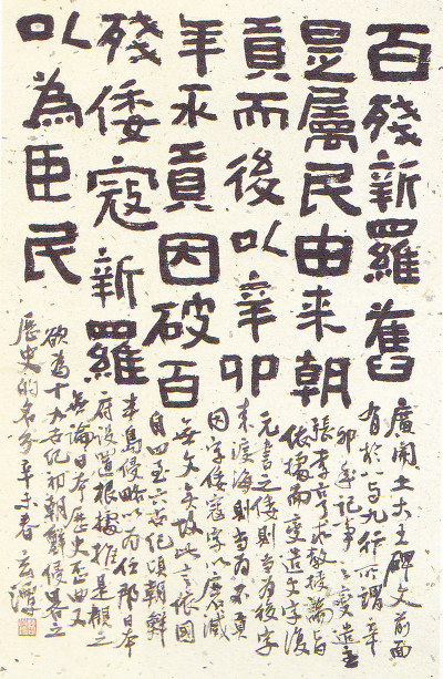 이러한 선생의 성품은 서예술의 형성과도 연결된다. 선생의 글씨를 처음 본 것은 93년 白岳美術館 전시장에서였다. 선생의 글씨는 일반 한국서예에서 볼 수 없는 특이한 기운이 느껴졌다. 발굴된지 얼마 안 된 신라 古碑를 소재로한 작품도 있었고, 중국의 글씨를 임서한 작품도 있었다. 그중에서도 장천비에 대한 해석이 무척 독특하게 느껴졌다.