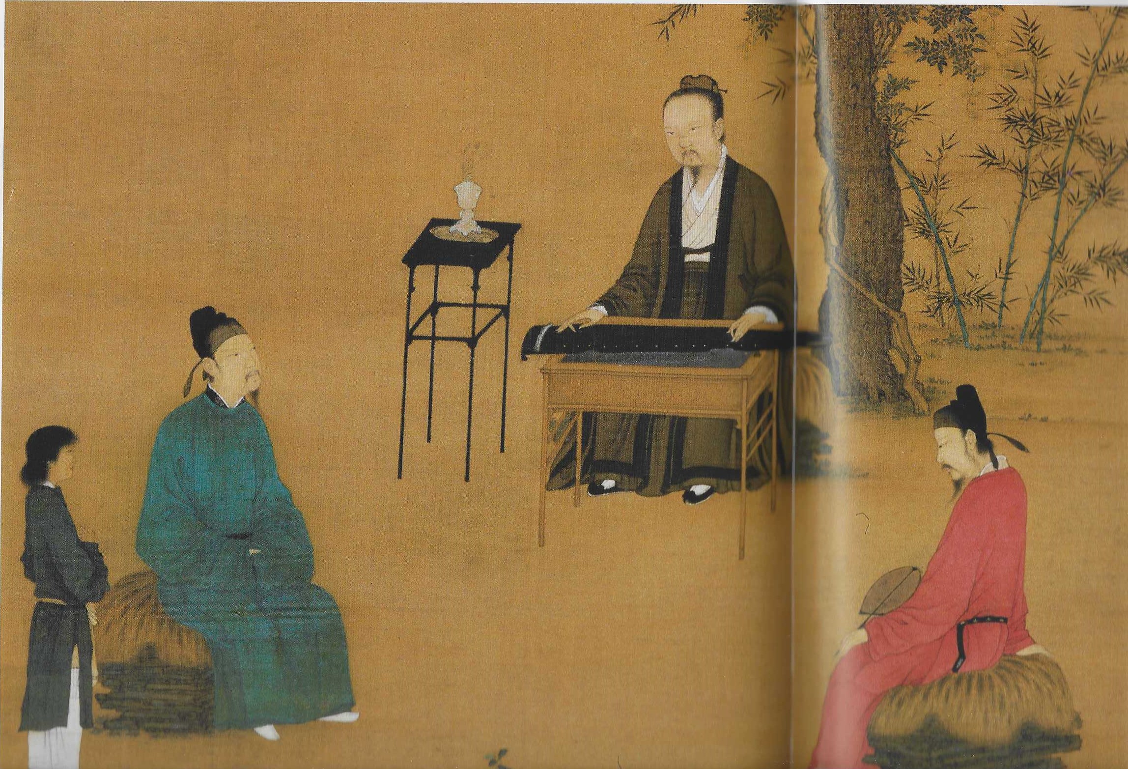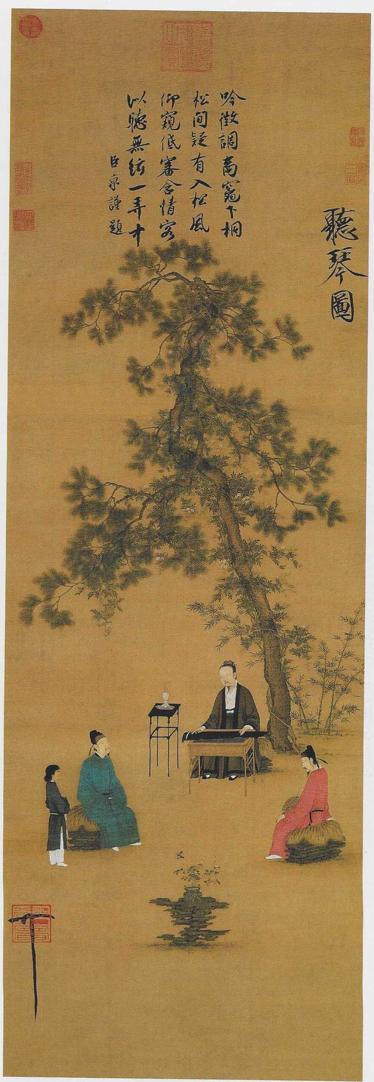 소나무 아래에서 거문고를 연주하고, 그 앞에는 연주곡을 감상하는 정경을 그렸다.