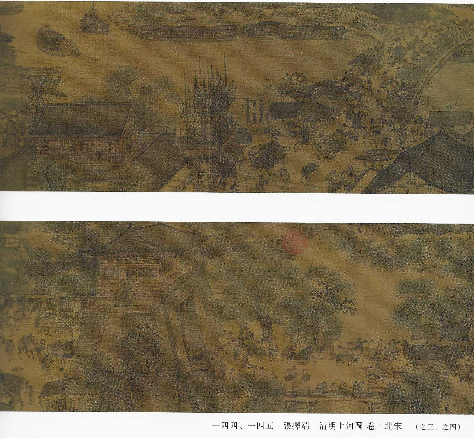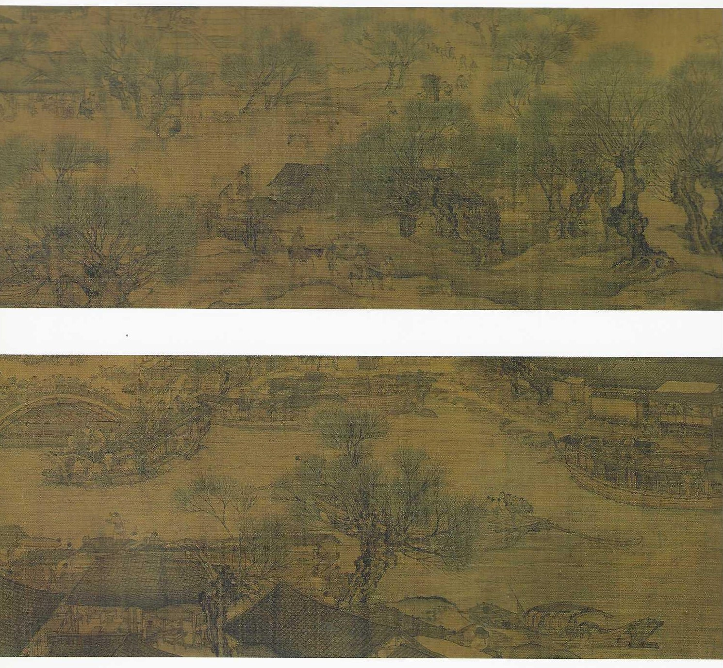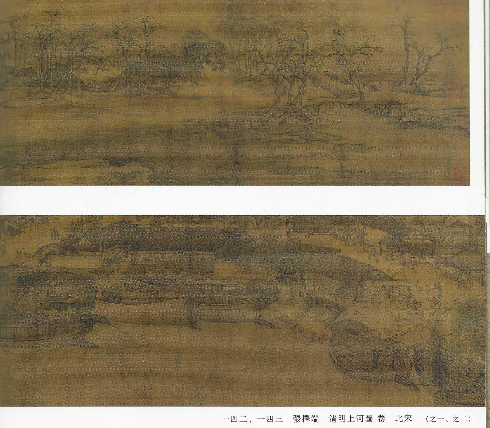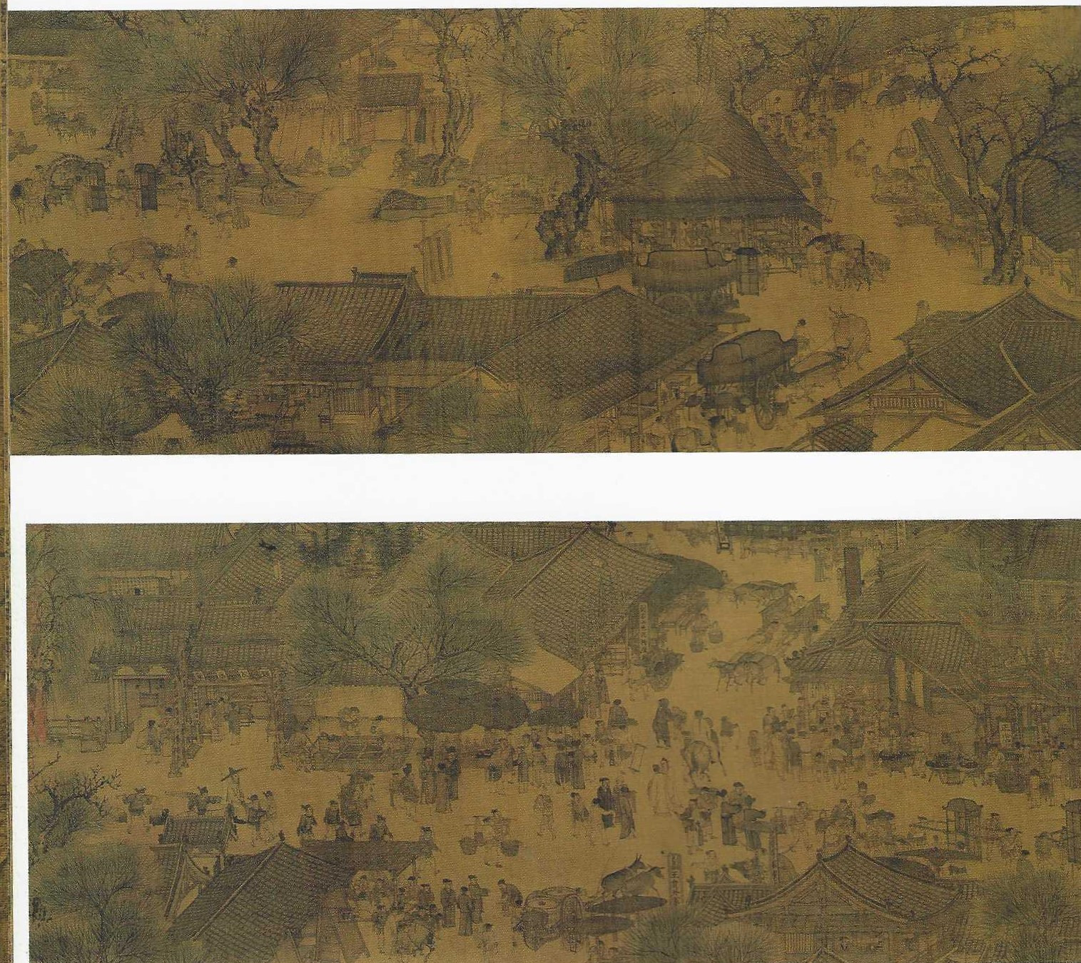 장택단은 그때의 도시 모습을 대형의 화폭에 담아내고, 청명상하도라는 이름을 붙였다. 이처럼 사회상을 대형 화폭으로 그리는 것이 북송-남송 때의 새로은 하나의 양상이었다. 자택, 정원,씨름, 야시장, 부두의 모습 등등, 생활의 모습이 아주 생생하다. 중국 무협 영화의 한 장면을 보는 듯한 느낌을 준다.
