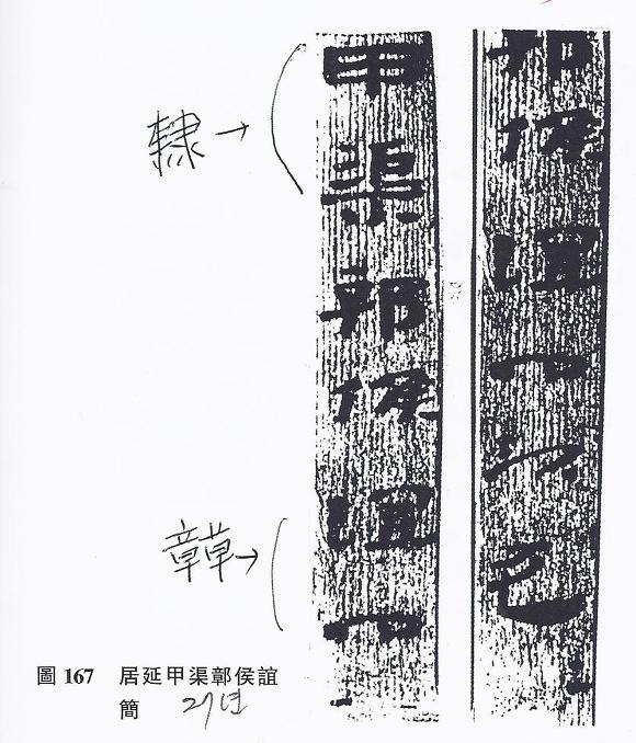 거연 한간 중에 원봉6년간(元鳳六年簡)에서 장초의 모양을 보여주고 있다. 거연의 잡거장후의 간에서도 예서와 초서체가 함께 나타난다.