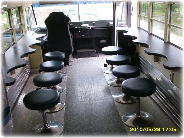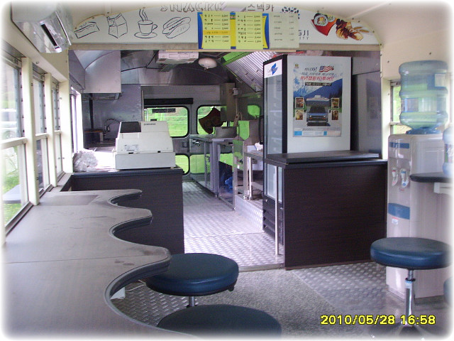 실내공간은 앞쪽은 고정의자와 탁자가 배치되어있고 뒷쪽은 주방기구들이 자리했습니다.