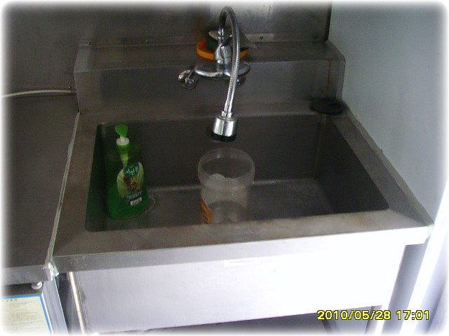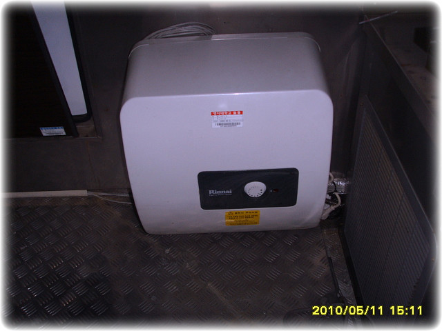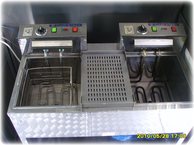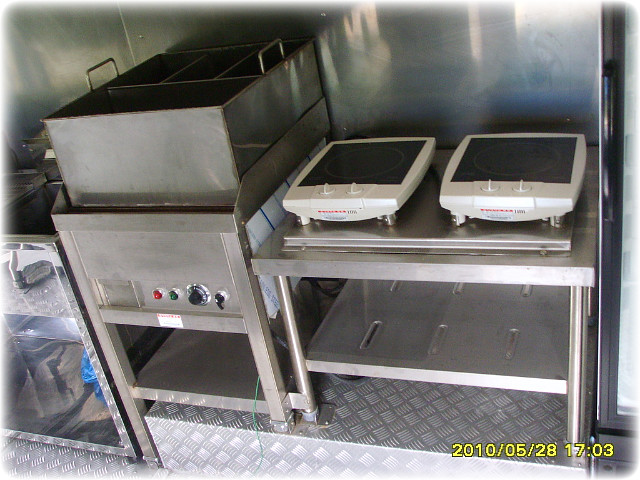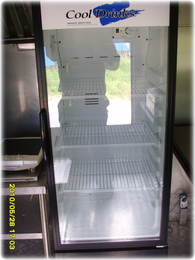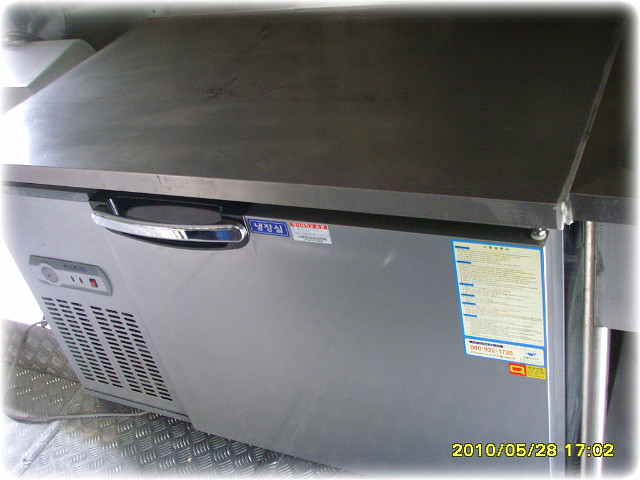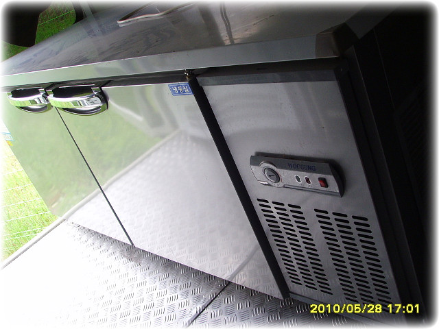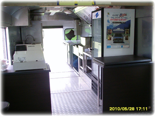 조수석 뒸쪽 주방에는 계산대 바로뒤에 옆문판매대가 설치되어있고 전기순간온수기와 싱크대및천장수납장과 야채냉장고 두대비치되어있습니다