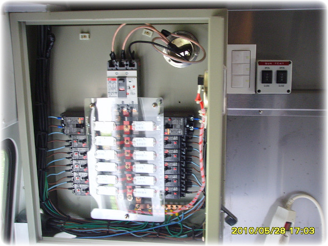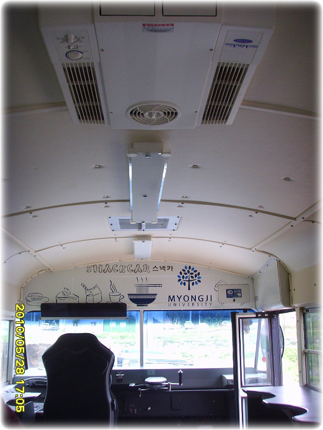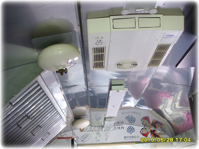 앞쪽에 루프에어컨과 뒷쪽은 에어컨옆에 소화기까지 구비되어있습니다