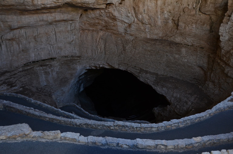 - 걸어서 들어가는 코스(Natural Enterance Route): 박쥐 비행쇼를 구경하는 야외극장 옆을 통해서 동굴로 들어가는 방법이다. 단면도의 청색으로 표시한 길이다. 입장 시간은 여름철인 경우에는 8:30am~3:30pm까지다. 내려가는 길(Trail)은 포장이 잘되어 있고 조명이 잘되어 있다. 동굴속으로 내려 갈수록 높고 넓은 공간으로 바뀌면서 신비로운 지하 세계의 예술품들을 보게된다. 악마의 굴(Devils Den),마녀의 손가락(Witches Finger)등이 인기있는 볼거리다. 약 2km(1.25마일) 정도를 걸어내려가면 엘리베이터를 타고 내려오는 지점과 만나게 된다. 여기서는 빅룸(Big Room)을 둘러 본뒤 엘리베이터를 타고 방문객 센터로 올라오면 된다.