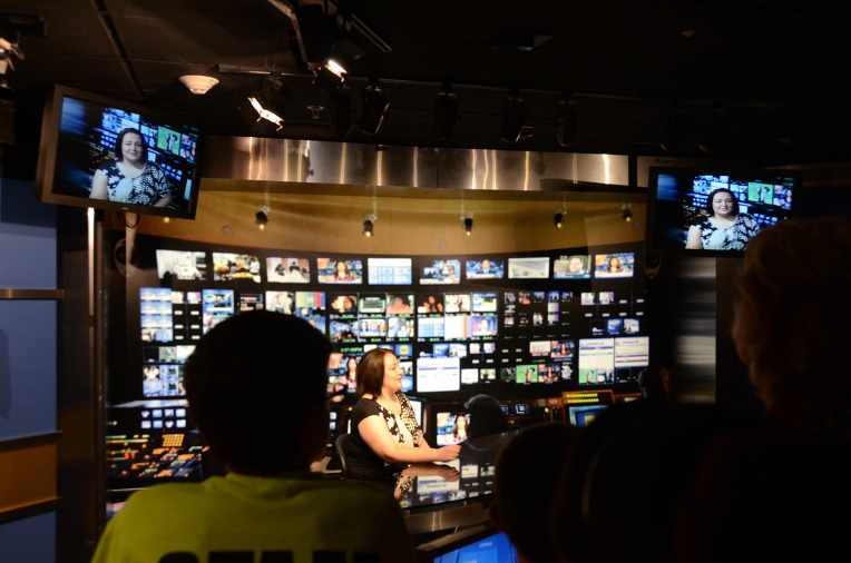 우리 투어팀에서 한명의 미래 여성 앵커가 자발적으로 뉴스를 진행하는 모습이다.
