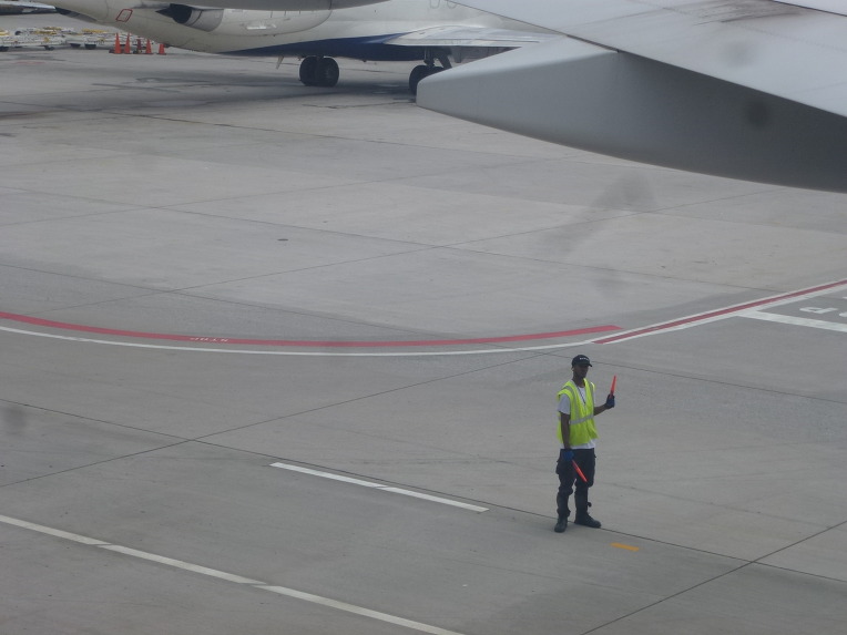 이륙과 착륙 과장을 잠시 소개하려고 한다. 내가 탄 비행기는 이 사람 안내를 받으며 활주로를 서서히 나아간다.