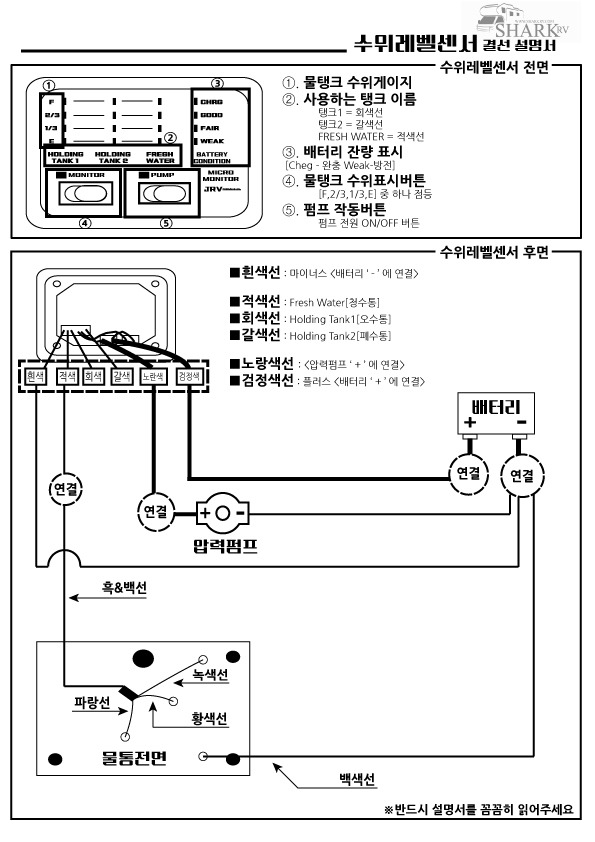 -수위레벨 센서는 캠핑카의 청수[식수] , 오수 , 폐수 통에 달린 센서를 연결하여