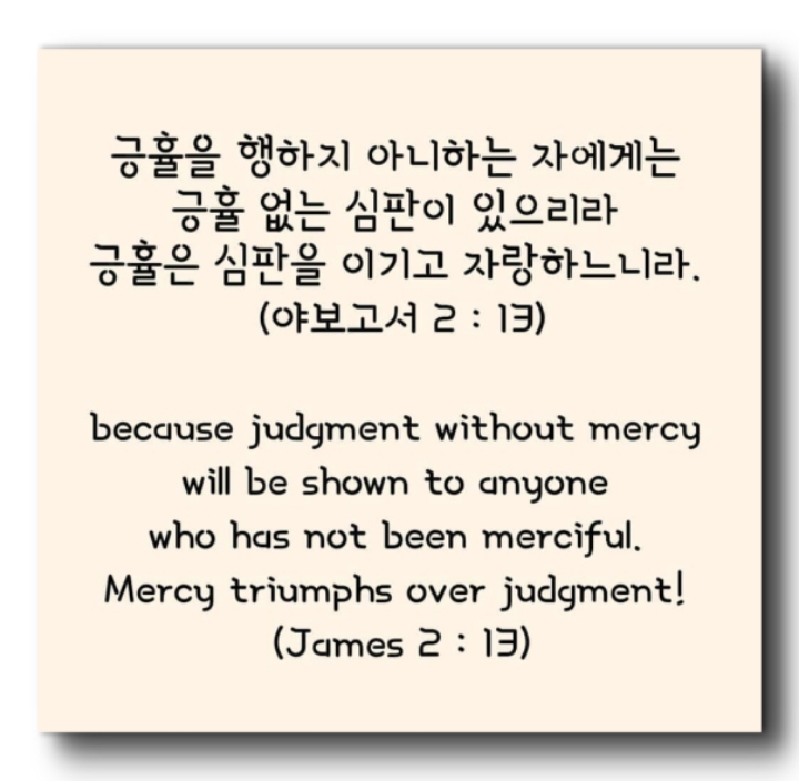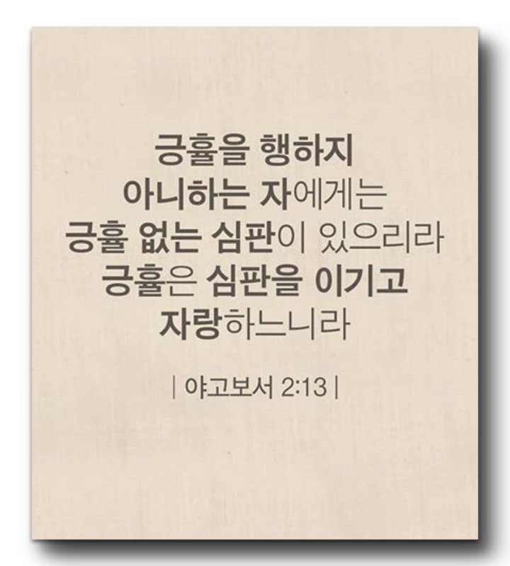 긍휼을 행하지 아니하는 자에게는 긍휼 없는 심판이 있으리라 긍휼은 심판을 이기고 자랑하느니라
