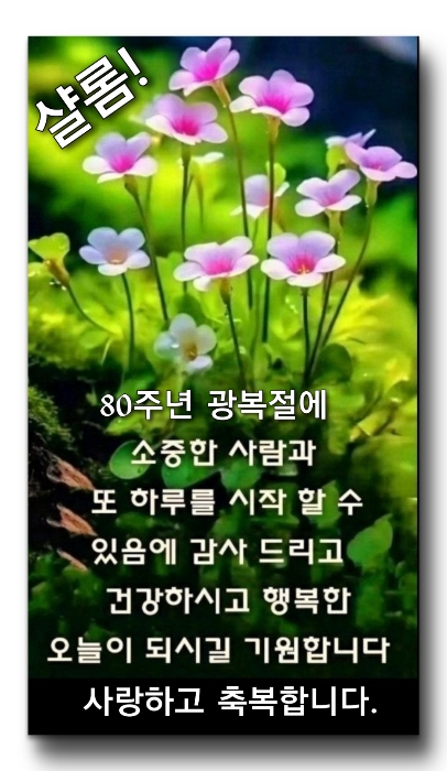 지나간 밤에도 주님의 사랑 날개 그늘에서 평안히 쉼을 누리게 하셨다가 오늘도 참으로 소중한 광복 80주년을 허락 하시고 새로운 하루를 은혜로 허락 하심을 진심으로 감사를 드립니다.