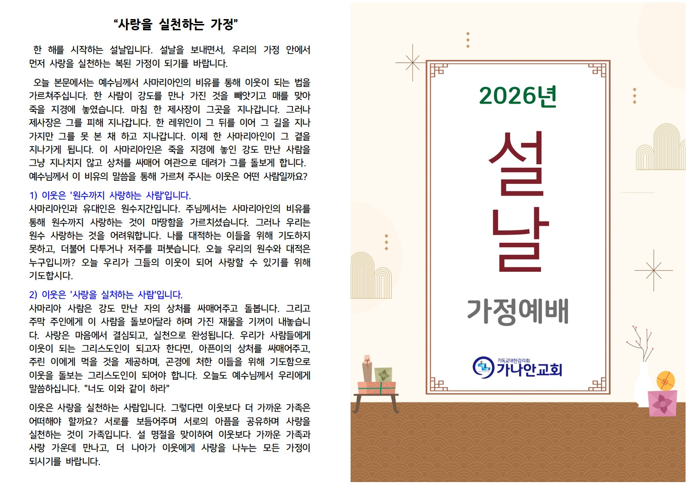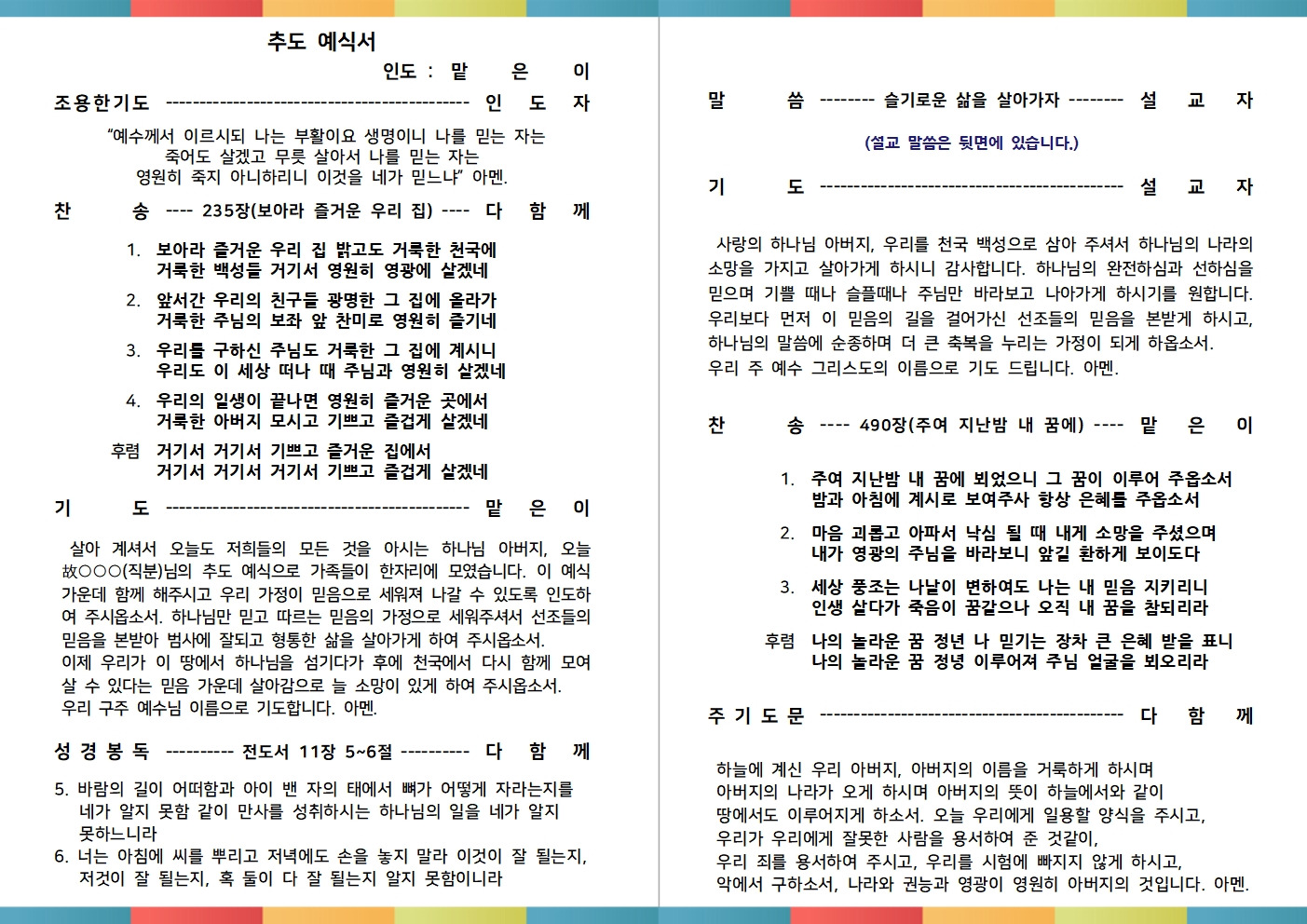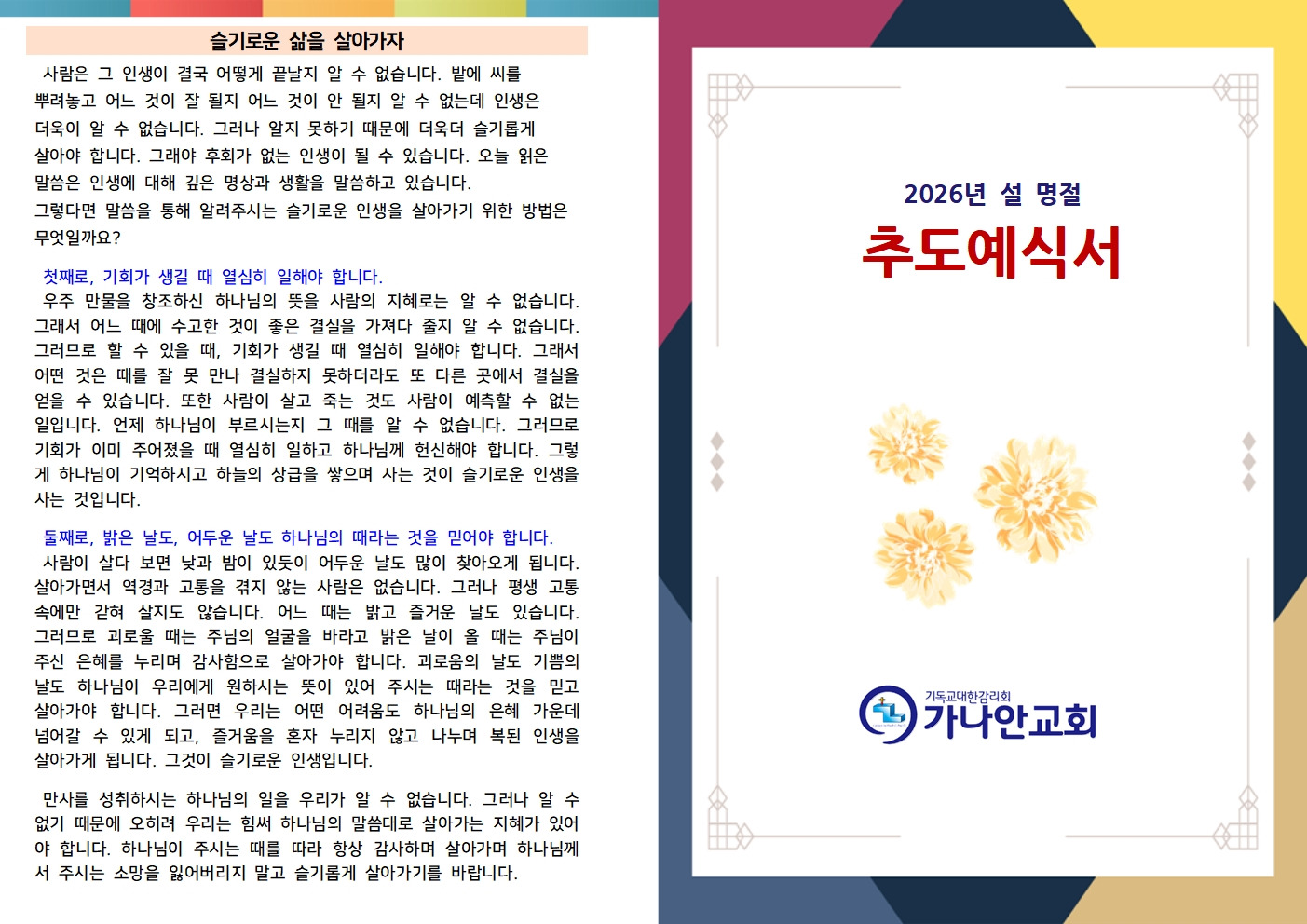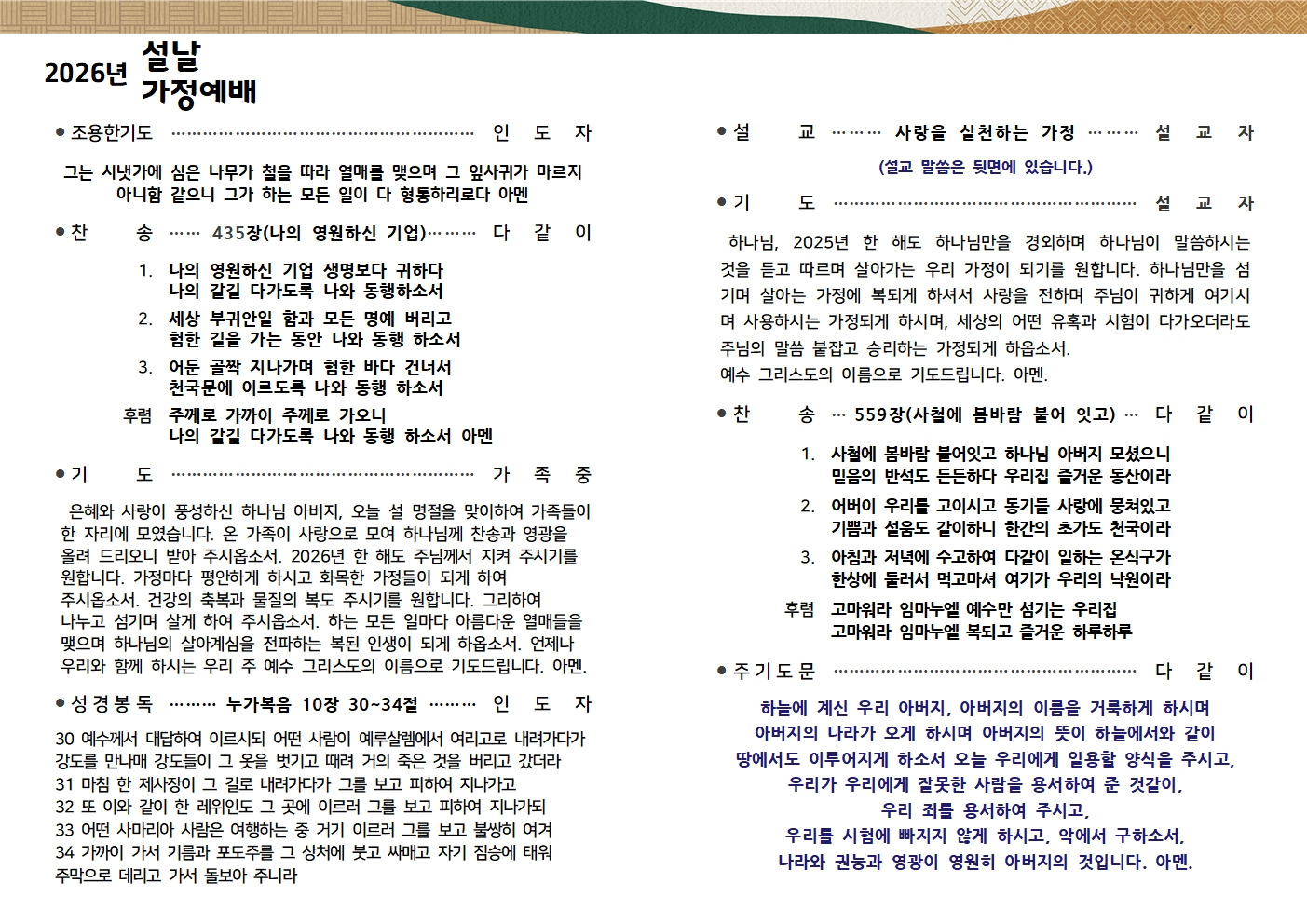 2026년 설명절 예문 안내(가정예배, 추도식) 작성자관리자2|작성시간26.02.07|조회수495 목록 댓글 0 글자크기 작게가 글자크기 크게가 2026년 설명절 예문 가정예배 순서지와 추도예식서를 첨부파일로 올려드립니다. 필요하신 성도님들께서는 내려받기 하셔서 예배드리시기 바랍니다. 2026년 명절예배문(설).hwp1.56MB 2026년 추도예식서(설).hwp269.50KB 첨부파일첨부된 파일이 6개 있습니다. jpg 파일 2026년 명절예배문(설)002.jpg 다운로드 jpg 파일 2026년 추도예식서(설)001.jpg 다운로드 jpg 파일 2026년 추도예식서(설)002.jpg 다운로드 jpg 파일 2026년 명절예배문(설)001.jpg 다운로드 hwp 파일 2026년 추도예식서(설).hwp 다운로드 hwp 파일 2026년 명절예배문(설).hwp 다운로드 다음검색 현재 게시글 추가 기능 열기 북마크 공유하기 신고 센터로 신고 댓글 댓글 0 댓글쓰기 답글쓰기 댓글 리스트